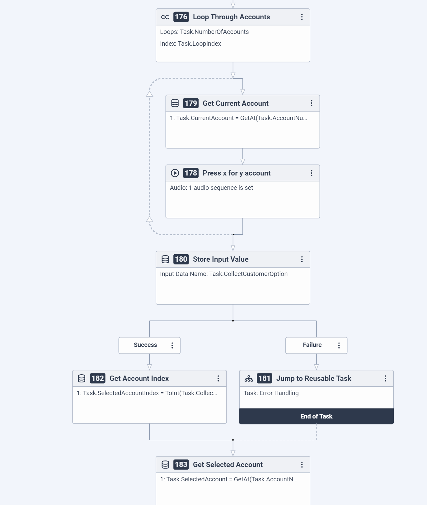 Get the current account in the loop GetAt(Task.AccountNumbers, Task.LoopIndex)