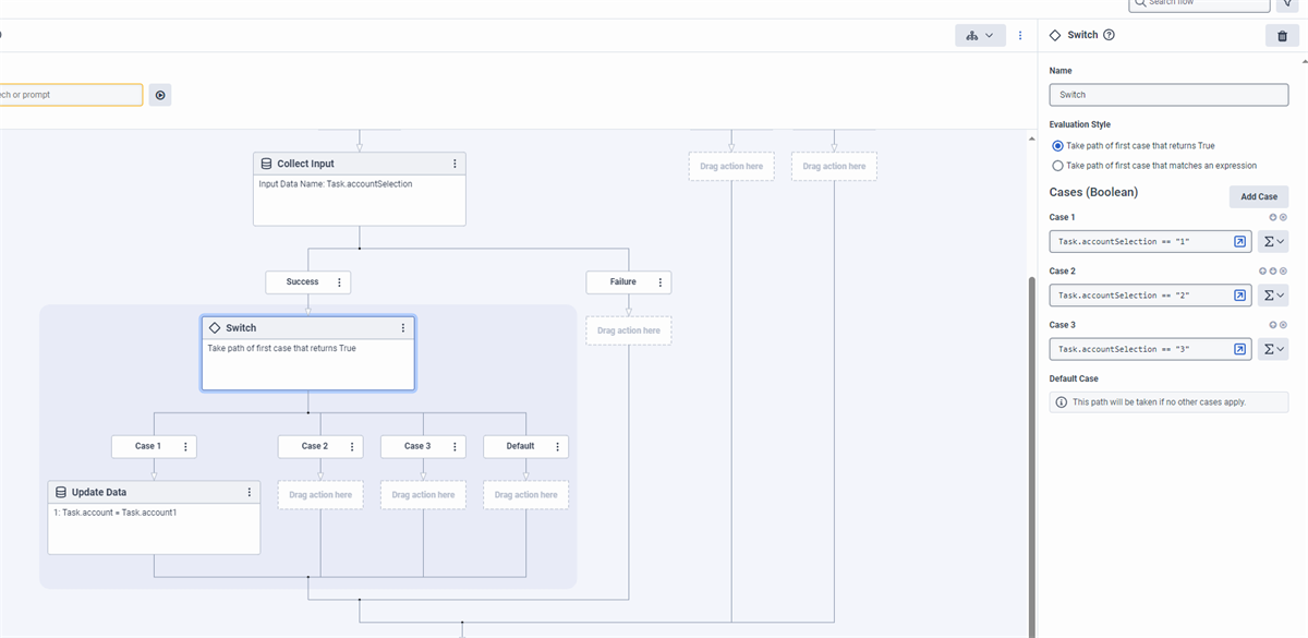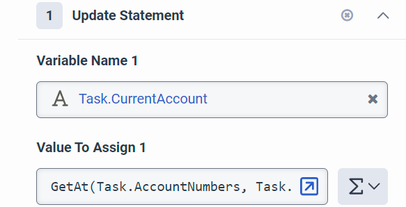 Then the final step Task.SelectedAccount (which yes could be part of the same update data action instead of using 2 update data actions) looks like this: GetAt(Task.AccountNumbers, Task.SelectedAccountIndex)