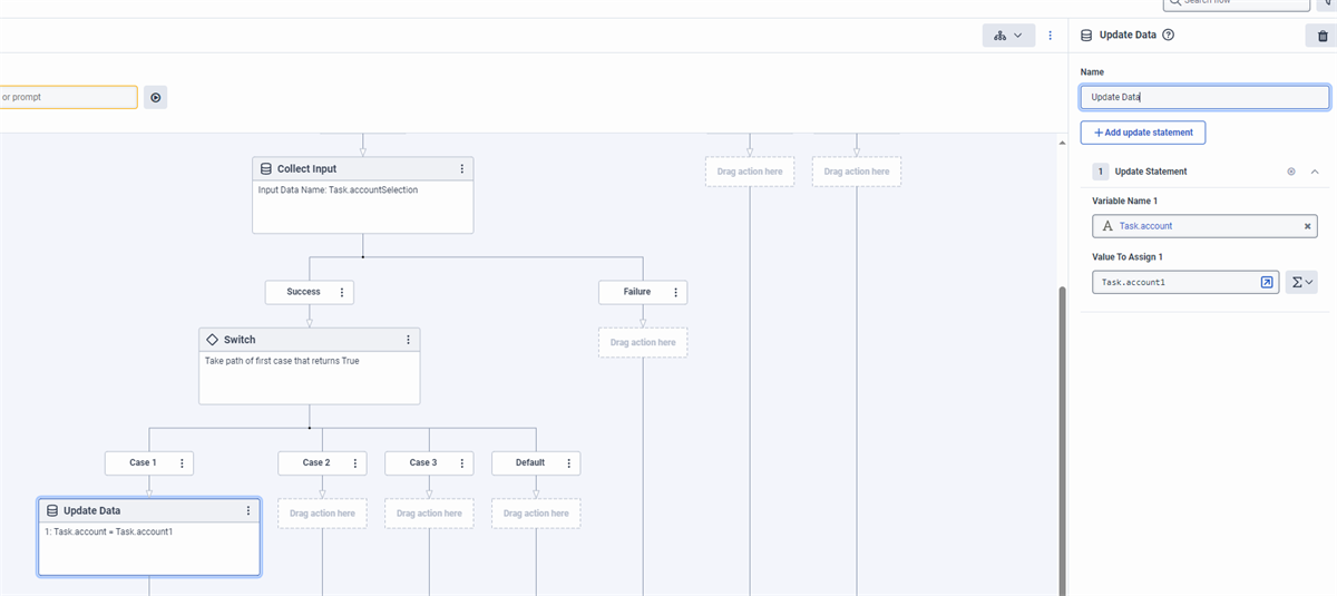 3) After the customer selects the account to use, can you set the variables that will be used for the remainder of the actions or how does that work? Yes, you can use the Update Data action to set any variable to any value whenever you like. As well as being able to access any defined variable as it is stored in memory for the duration of the entire flow. Update Data Variables do NOT transfer between call flows.