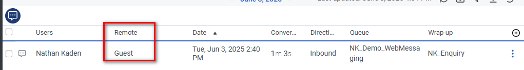 If you set the below participant data then you see Nathan K in the web messaging transcript and the agent can see this name when on the interaction, but this doesn't update the Remote Name in the interaction view.