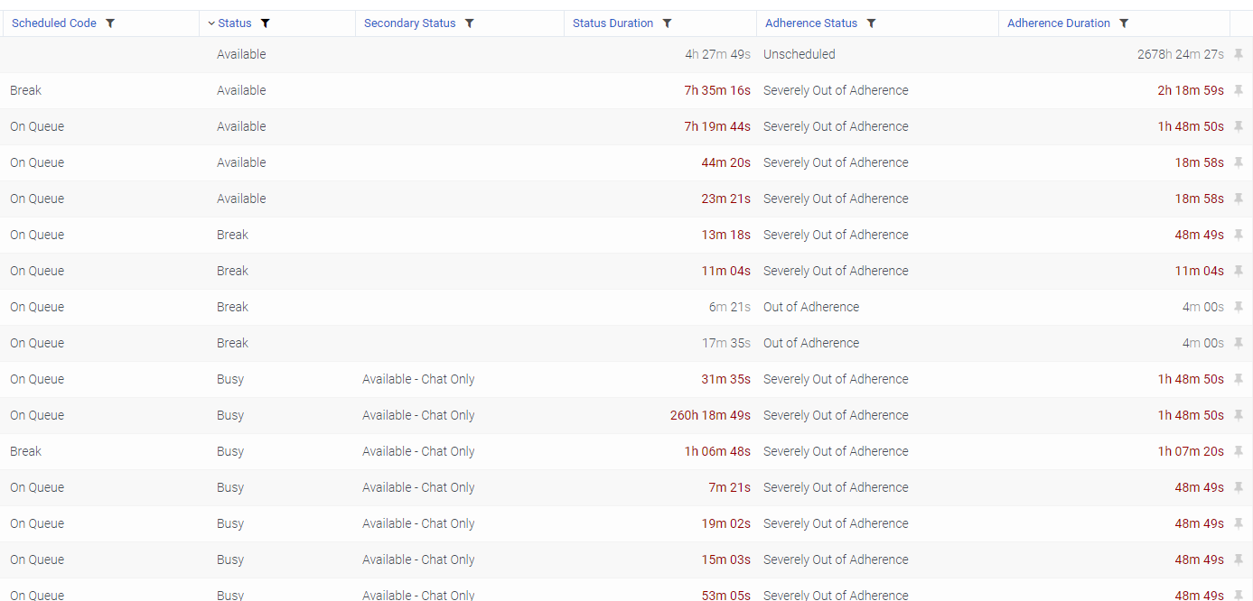 I understand how adherence works. That isn't the issue. Yes, the issue is we are using Salesforce and need to map those codes to being "in adherence" on certain codes. Our chats are being routed through Salesforce, not Genesys, so will not show in Genesys Cloud correctly. We do put some off queue time, but we often flip them back and forth in real time.