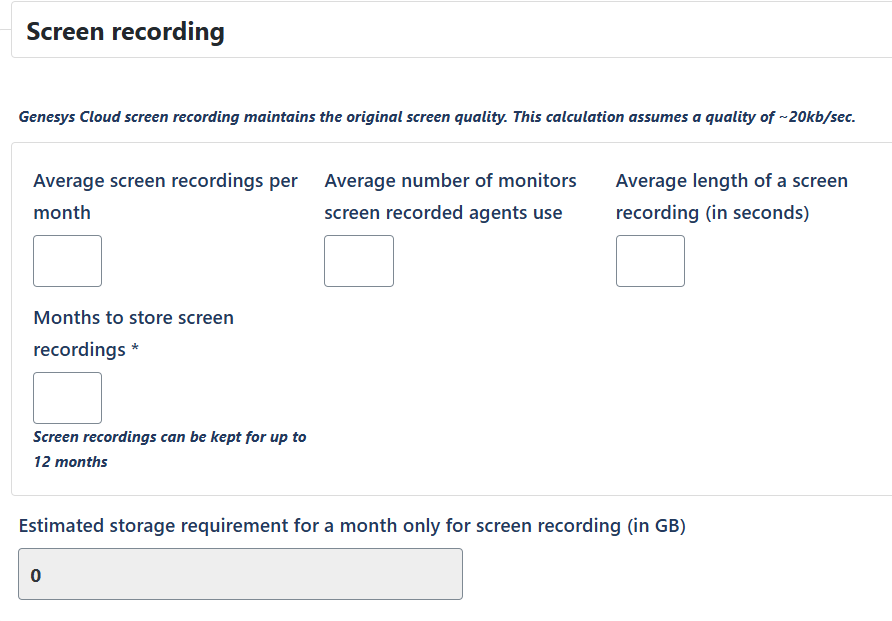 I believe you would just need to enter an estimate for each of those. By default, when screen recording is enabled, it will record during the agent's handle time but you can make policies to start and stop or extend screen recordings. I would recommend using your average number of interactions handled, average monitors per agent, and average handle time.