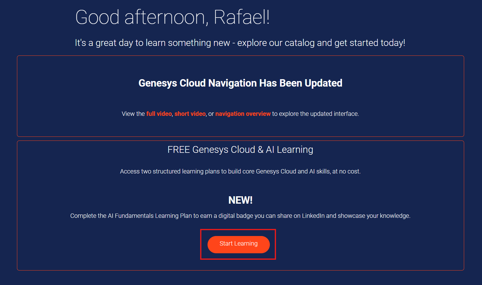 - If the "Start Learning" button doesn't appear, you can try the following link: https://learn.genesys.com/pages/293/beyond-core-dashboard