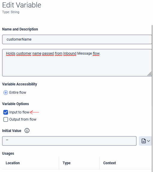 3. from the Inbound Message flow, call the Bot or DX bot flow and you will have the Input variable option, your enter the variable holding the retrieved value in step 1, example State.customerName