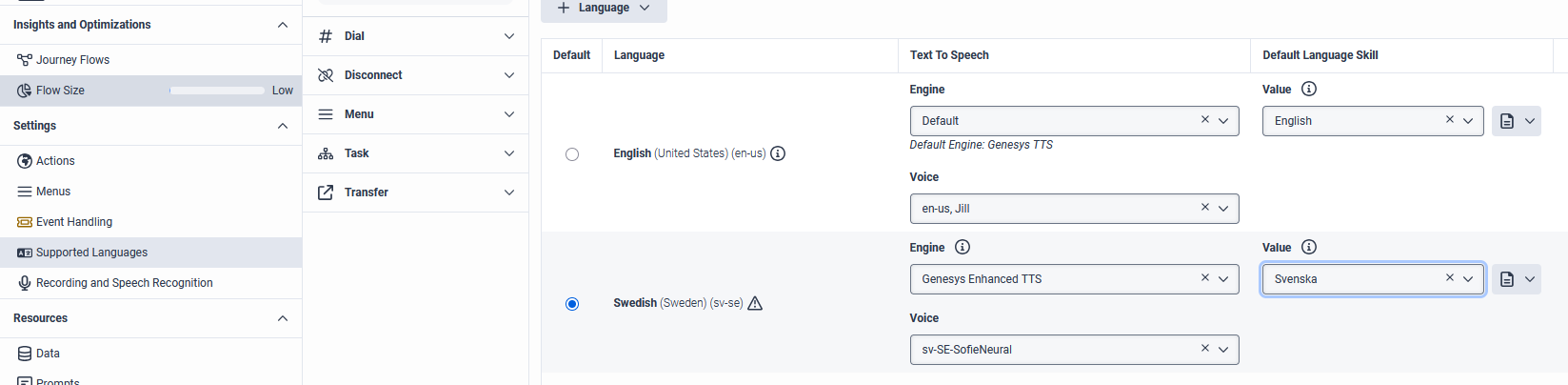 Our contact center provides service in English and French, with most interactions in English. In my flow, I set the Language to fr-ca when the caller chooses French.