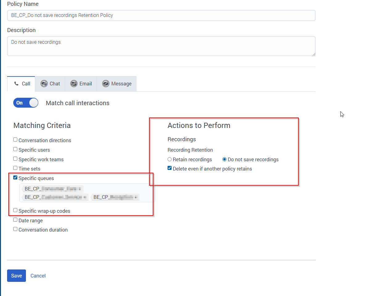 When I configure a recording policy for Queue B with the setting "Do Not Save Recordings", and then transfer the call from Queue A to Queue B, the entire call recording is not available in the Interaction page. It shows that the recording is not available at all.