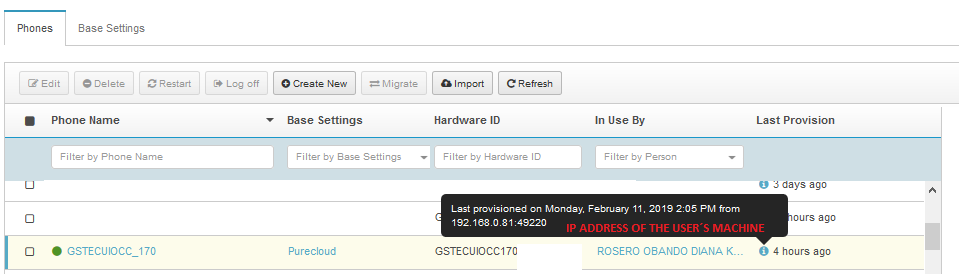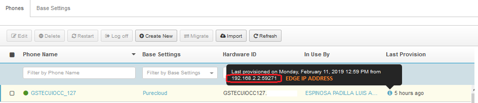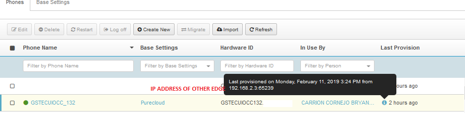 When we provisioning the Purecloud softphone at edge FQDN, on the Phone Management view appear all the phone user that´s work in green (online state) but if I put the mouse over the Last Provision column (letter i) appear the information of the phone´s provisioning