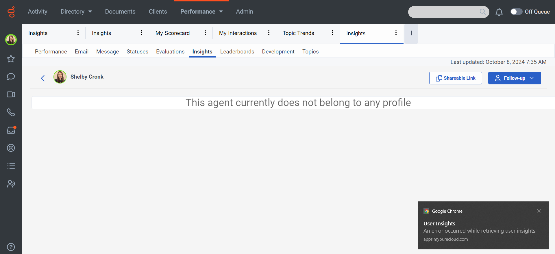 When attempting to dig into a particular agent, I am receiving an error that the agent is not a member of a profile. This is not true on any level; the agent has been and continues to be a member of a profile. Have had it for several agents (not just the one). What's the fix?