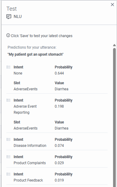 The top result is Intent: None... but I'm expecting the top result to be Adverse Event Reporting (the second result). Why am I getting Intent = None as a consistent top results? This is odd. Are slots assigned to None? I don't see None as an intent anywhere.