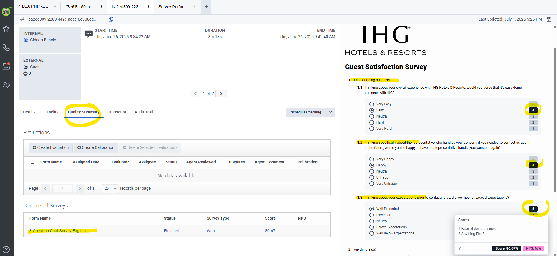 Currently, when we extract data, we can access the survey form and overall survey scores, but we are unable to retrieve the individual scores for each question. The only way we can obtain this information is by manually opening each interaction, navigating to the quality summary, and clicking on the completed survey. This process is quite time-consuming and not very efficient for our data gathering needs.