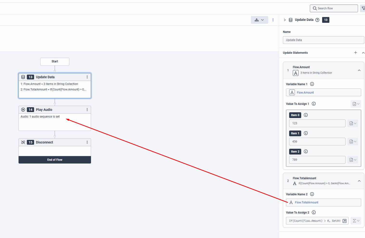Passed Flow.TotalAmount into the Play Audio block for playback.