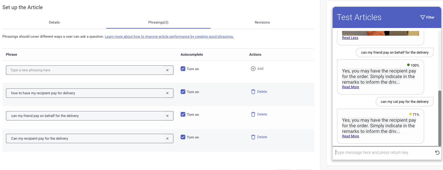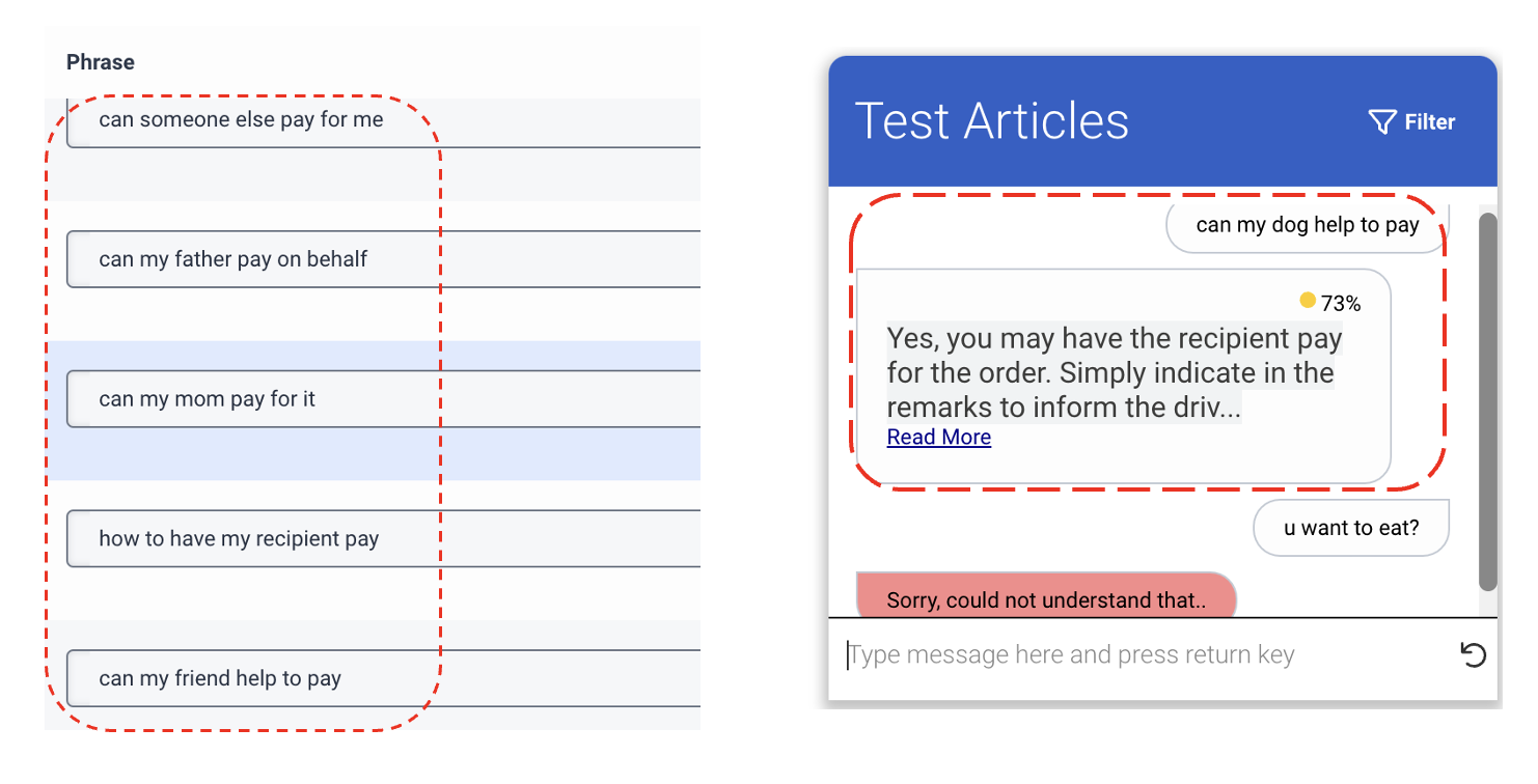For example on the article screen shot below I have setup with 3 different phrasings. But when I ask a different phrase e.g. "can my cat pay for the delivery" it returns a confidence of 71% accuracy, which is not correct.