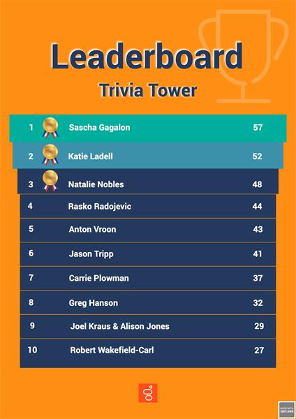 It's really heating up now. The new leaderboard is revealed for those of you participating in our Trivia Tower events. So many people jumped up in rankings, it's incredible! A big shoutout to @Sascha Gagalon, @Katie Ladell, and @Natalie Nobles - you are our top three for this week. Congratulations!