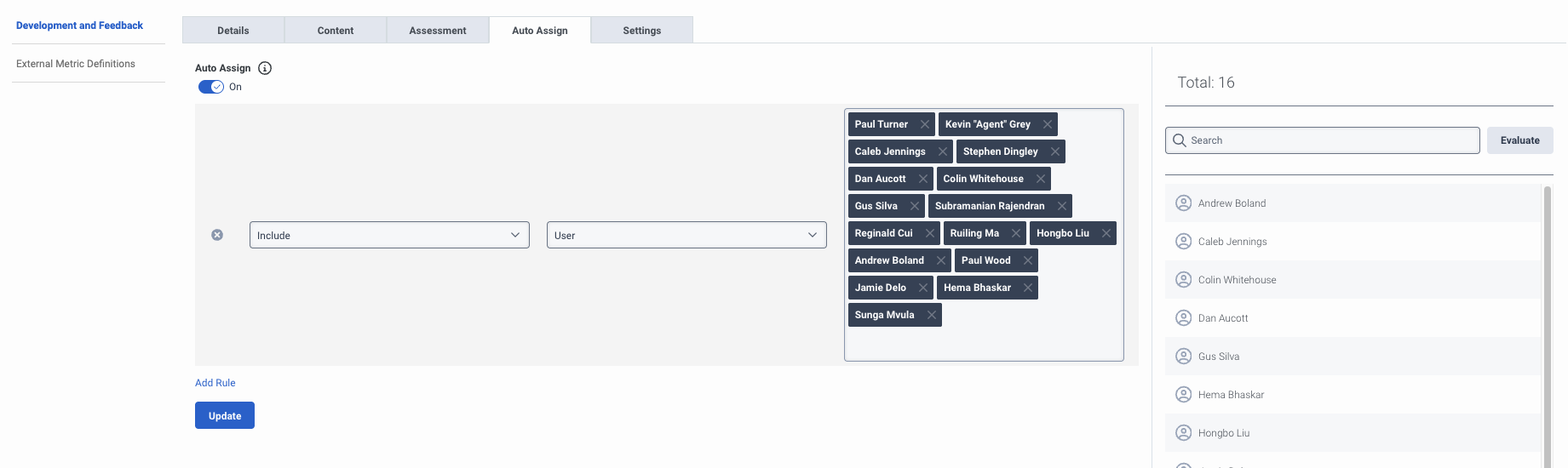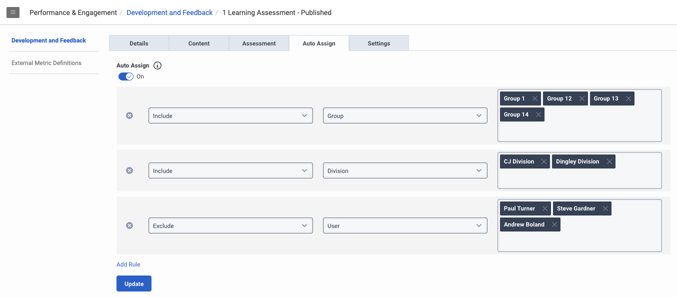 We are delighted to announce that we have launched a quality of life improvement to Development and Feedback by adding Users to Auto Assignment Rules. Got a list of users ready for training who don't fit a predefined group? Just add the users to the assignment rule and away you go.