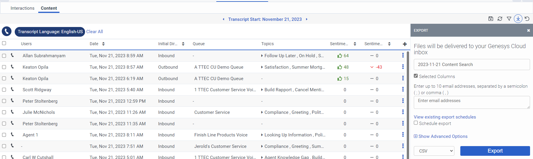 How can I view and export a listing of client interactions along with their sentiment scores?