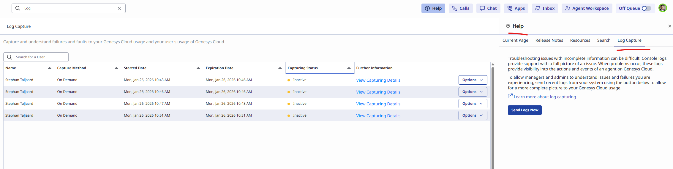 I logged into workspace, set myself to OnQueue, then wen OffQueue, and then went to Log Capture and typed my name. I set the time to 3:00 PM - 3:20 PM (it is 3:18 PM now) and it does not show anything.