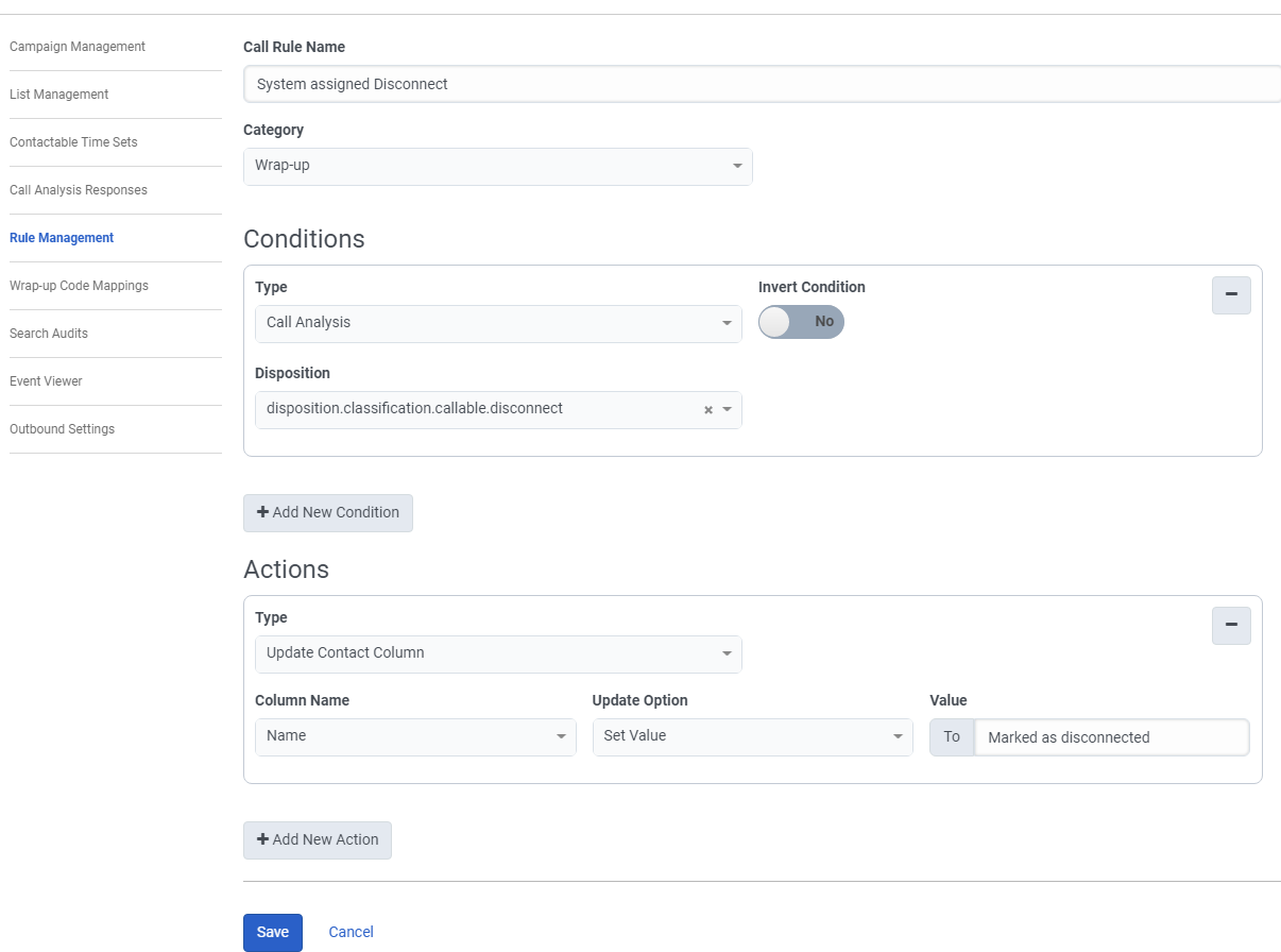 disposition.classification.callable.disconnect" and then set my action to just change the name field to something indicating the caller disconnected before an agent answered as a test. I could make the contact not callable or the number and I am sure it would still work just fine. From what I can find these are the system generated wrapups (I added a few that I was able to find myself):