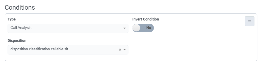 | Call Analysis | Available in wrap-up rule conditions only. Allows you to perform an action when call analysis detects a busy signal, answering machine, live person, or when no one answers the call. For example, you can set the rule action to schedule a callback in 10 minutes if a line is busy. The Disposition box allows you to select Busy, Machine, No Answer, or Person. In special cases, you may type a free-form call analysis condition instead. For example, you might type disposition.classification.callable.sit. This feature supports any call analysis disposition that PureCloud Edge may return. |
