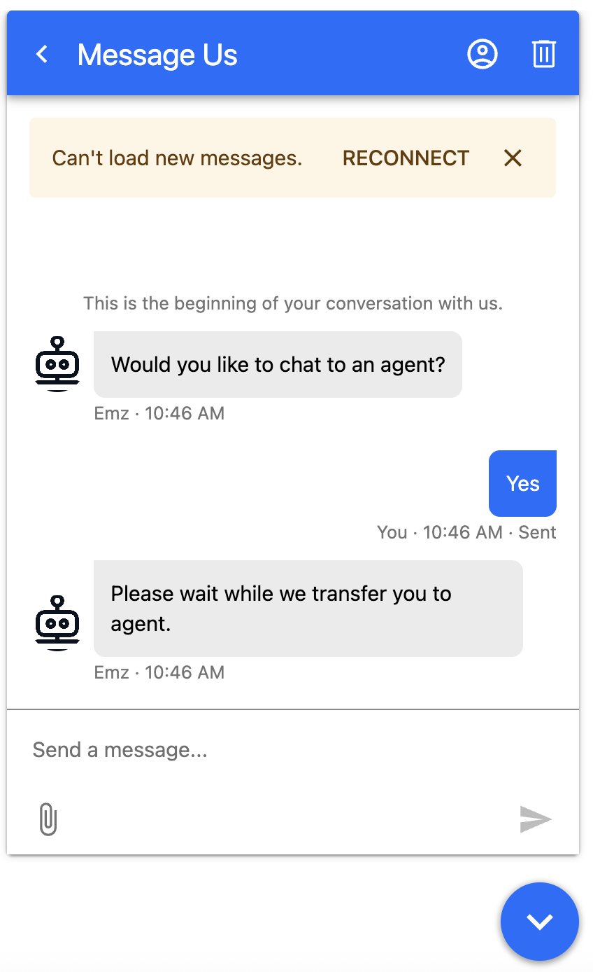 Team - raising this for visibility, we are planning to rollout a new UX improvement around re-connection handling, so that end-user can react upon connection failure and automatic reconnection attempts. We want to avoid showing the older `Reconnecting` label which was getting stuck in some edge cases, blocking the overall experience.
