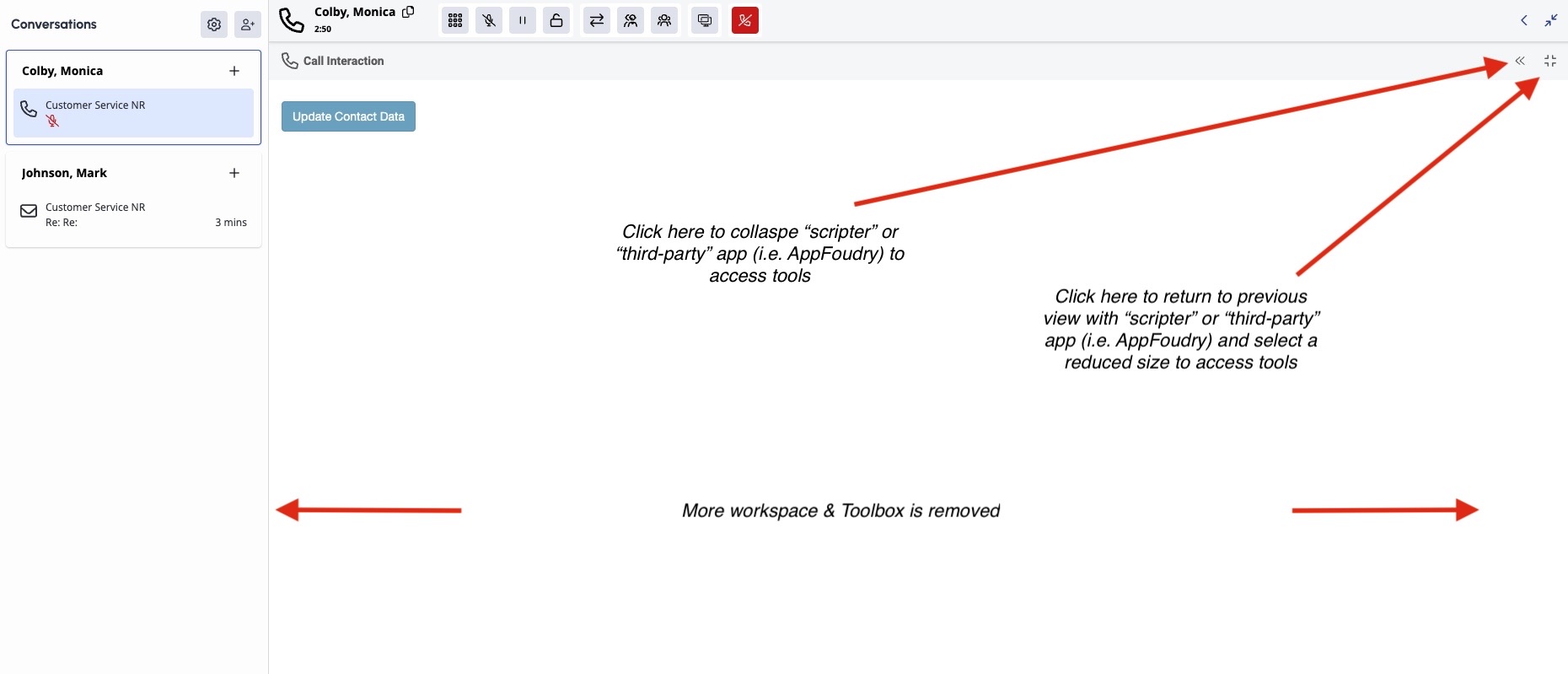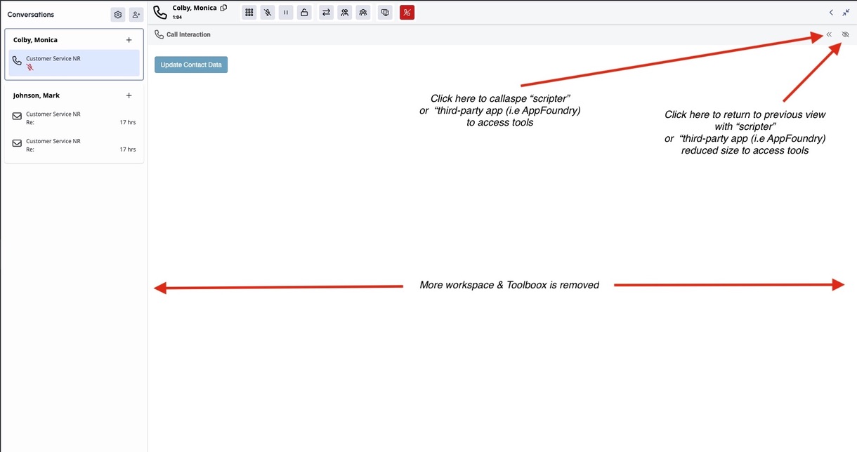Focus Mode within Agent UI that enables selected apps to expand beyond the XL panel constraints, allowing them to temporarily occupy the entire agent workspace (excluding persistent UI elements like call controls). Focus Mode enhances usability for visually larger apps like Scripter and 3rd-party integrations by eliminating space limitations that hinder productivity and user experience.