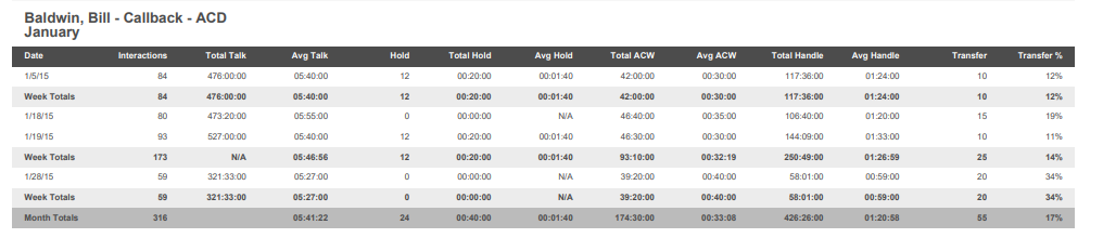 I was going through the Sample provided Genesys for Agent Metric Report, little confused that at some instances Avg talk is available for week total and Month total, but at some instance is shows NA. Though there are total talk data available date wise.