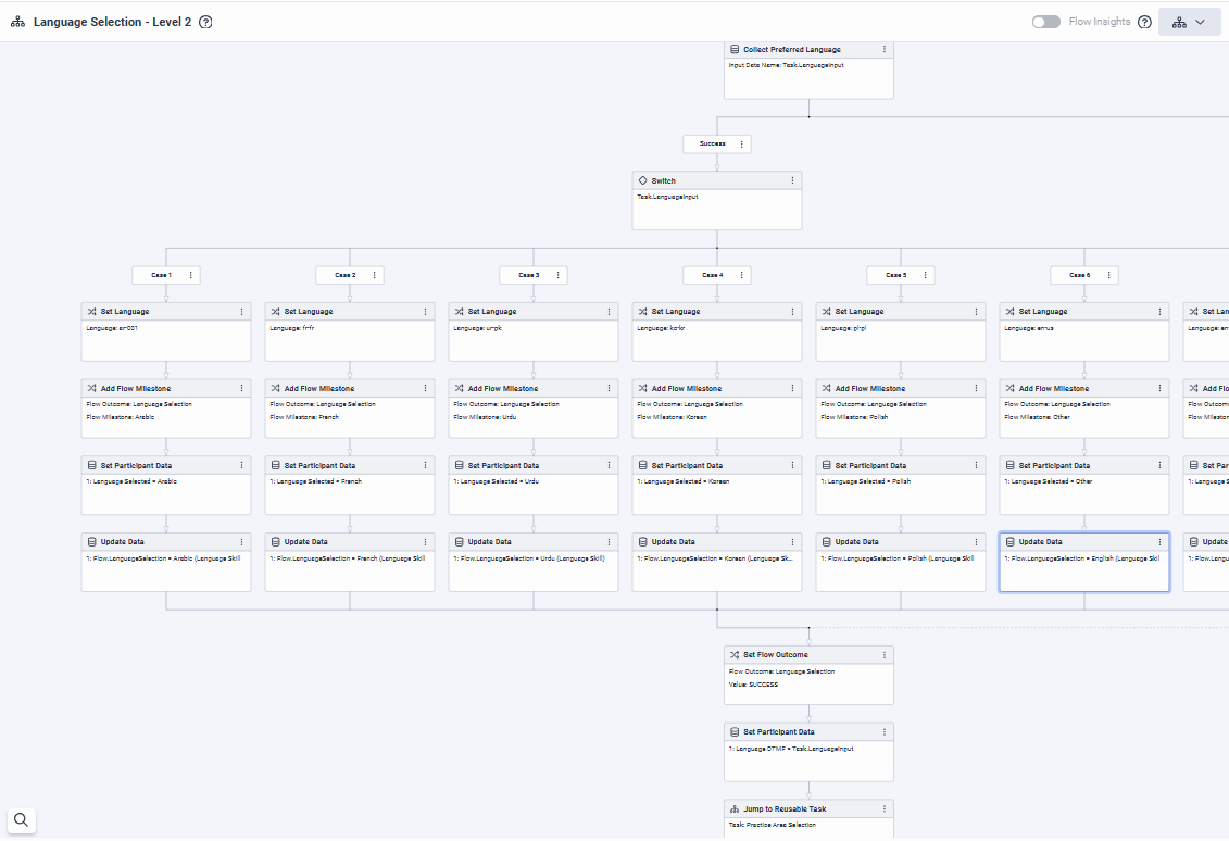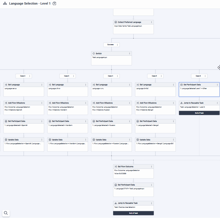 After selecting language, we need the caller to be offered the option of two reusable tasks. If the caller has one of the 6 languages offered the call flow works perfectly. For example, if you select Spanish as the language, you are then offered the next reusable task in the chosen language of Spanish, and same with the 3rd reusable task. However, we only want a single digit language selection option so need to have two levels of language selection offered. If the language is NOT one of the first 6 then the reusable tasks are offered only in English. Does anyone have an example of how they programmed two levels of language selection to work in an Incoming call flow?