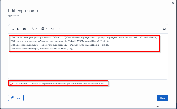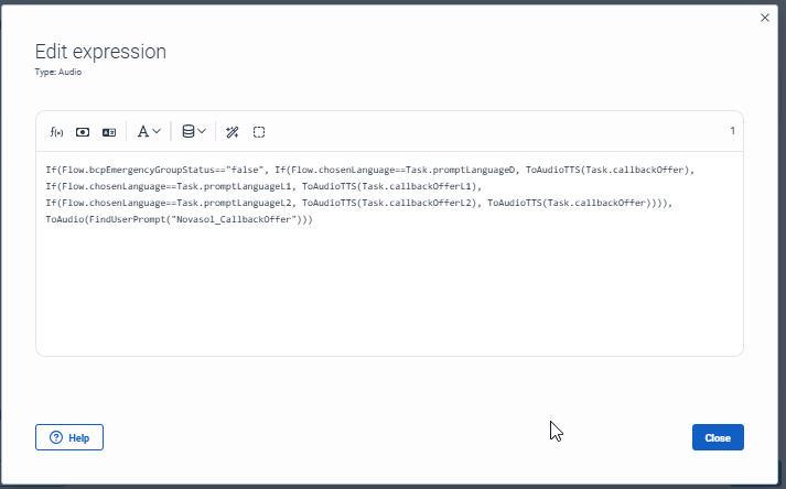 If(Flow.bcpEmergencyGroupStatus=="false", If(Flow.chosenLanguage==Task.promptLanguageD, ToAudioTTS(Task.callbackOffer), If(Flow.chosenLanguage==Task.promptLanguageL1, ToAudioTTS(Task.callbackOfferL1), If(Flow.chosenLanguage==Task.promptLanguageL2, ToAudioTTS(Task.callbackOfferL2), ToAudioTTS(Task.callbackOffer)))), ToAudio(FindUserPrompt("Novasol_CallbackOffer")))