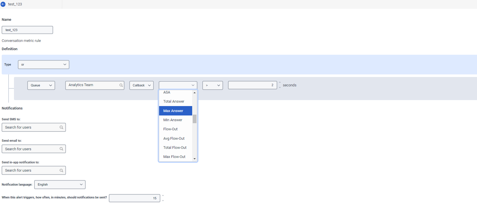 Additionally there are metrics like Max Answer and Max Wait - which allow for looking at all the conversations within that specific queue, in the current time interval and if the max values match the condition, then the alerts will be triggered.