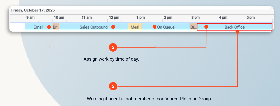 How? By configuring on queue activity codes and using them in Work Plan Configuration (for Schedule Generation or Rescheduling), or for manual shift edits. More details: