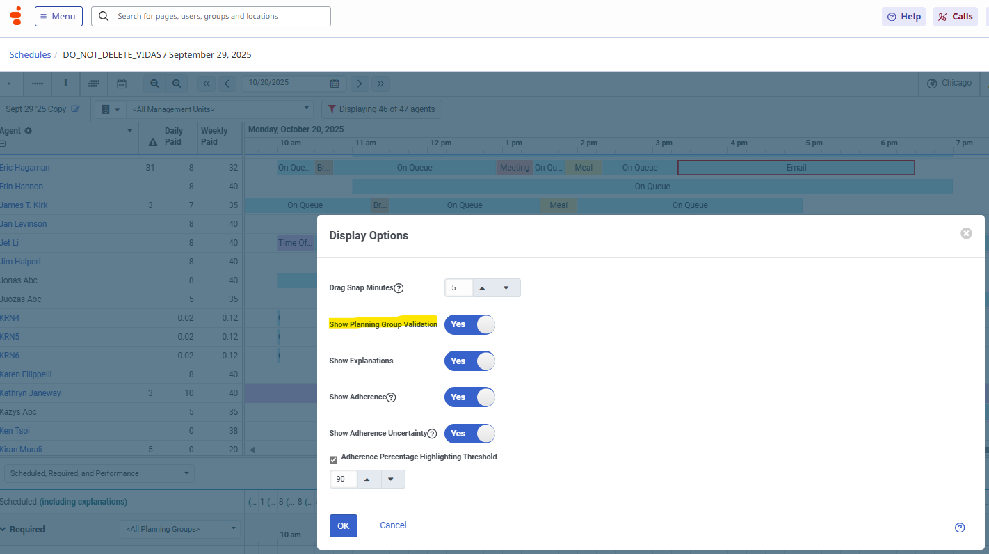 - Generate Schedules and Reschedule will holistically attempt to meet service goals for all planning groups in the Business Unit within the constraints of the work plans. If you have variable start times for breaks and meals (and even block scheduling on queue codes) all of that is taking into account.