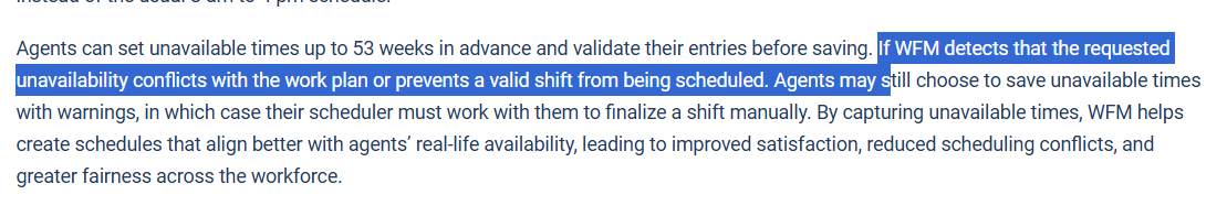 - Work within clear constraints - WFM will never schedule shifts during times marked as unavailable.