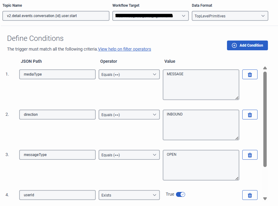 The Best event to trigger on seems to be, v2.detail.events.conversation.{id}.acd.end, since user.start did not seem to trigger.
