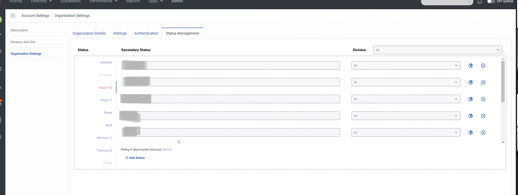 Subject: Organizational settings - status management - unable to assign division