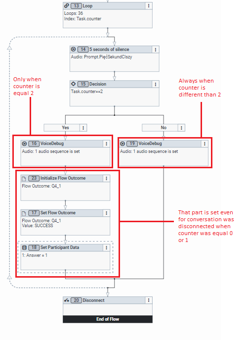 I have added TTS audio that speaks the counter value and whether the condition has been met and it looks like all should work fine but participant data and outcome flow are set even if the conversation is disconnected while counter is equal 0 or 1.