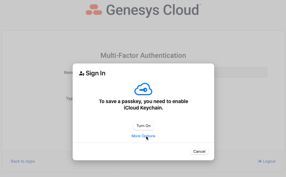 If you log in natively to Genesys Cloud using username and password (i.e. you don't log in via SSO), you can add an MFA device from the Splash Screen. Click on the My Account tile and select Add MFA Device. Give your device a name and select the Passkey option. Follow the instructions provided, which will be specific to the browser and the Operating System you are using. See screenshots below as an example of what this workflow looks like. In the example below, I selected "More Options" and scanned the QR code with my iPhone. Now, when I login, after I enter my username and password, I can use facial recognition on my iPhone as identity verification for MFA purposes. Simple and secure.