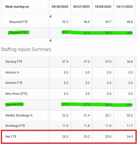 In the staffing summary section of the Capacity plan for example in week commencing 20th September it says that I required 52.2 FTE and that my planned FTE is 37.2 FTE and therefore my over/under FTE figure is -15 FTE. However the planned FTE is before it takes off the shrinkage as my planned FTE with shrinkage is 25.3 FTE (NET FTE) and I feel that the planned FTE figure for a cap plan should be inclusive of the shrinkage as our assumption is they will be off. Should the system not be comparing Required vs. Net as Required according to Genesys documenation includes shrinkage.