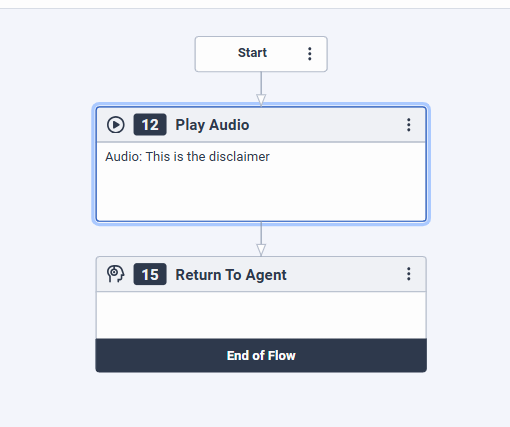 We also looked at button using transfer to Secure flow, which worked great apart from there was no recording which they needed for compliance, in secure flow there is an option to un-suppress recording, however that only recorded the client side and not the disclaimer.