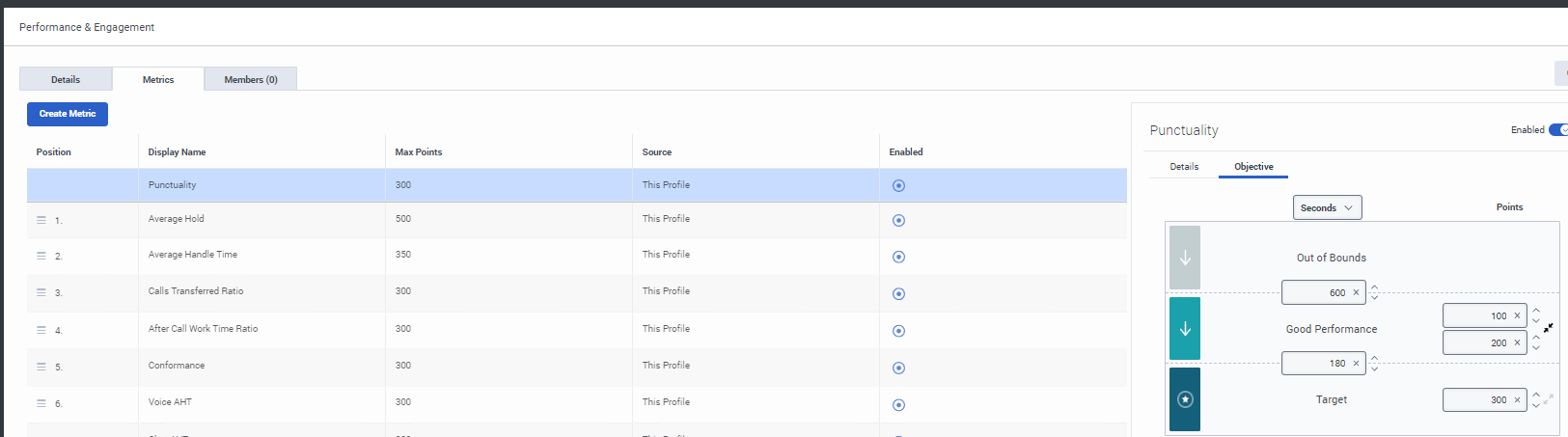 Can someone provide me with how the point logic works in Gamification. I looked in both the Resource Center and Developer tools and came up with nothing. I see it is a sliding scale for either way you move away from the goal. However the business really wants to understand how many points. For example if we use the default point system for the punctuality; I am on time I get 300 points, if I am 5 minutes late how many points are taken away? 10 minutes, 15 minutes etc. Good performance is at 180 seconds with 200 points same thing as I slide out of the 180 seconds how are the points deducted?