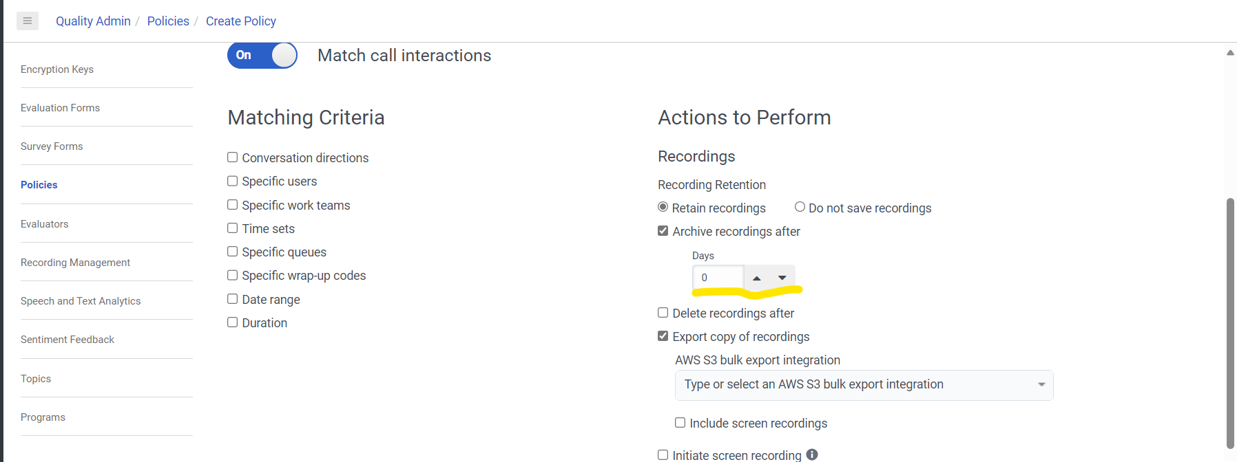 we have a requirement to move the recordings to S3 bucket immediately after the call completion. To achieve this, we are creating an S3 Integration and trying to set the policy to export the recordings to S3 Bucket. But there is no option of selecting the immediate option under the Archive recordings After, it has only the option to select the days. my question is if we set the days as Zero (0) will the recordings be moved immediately.