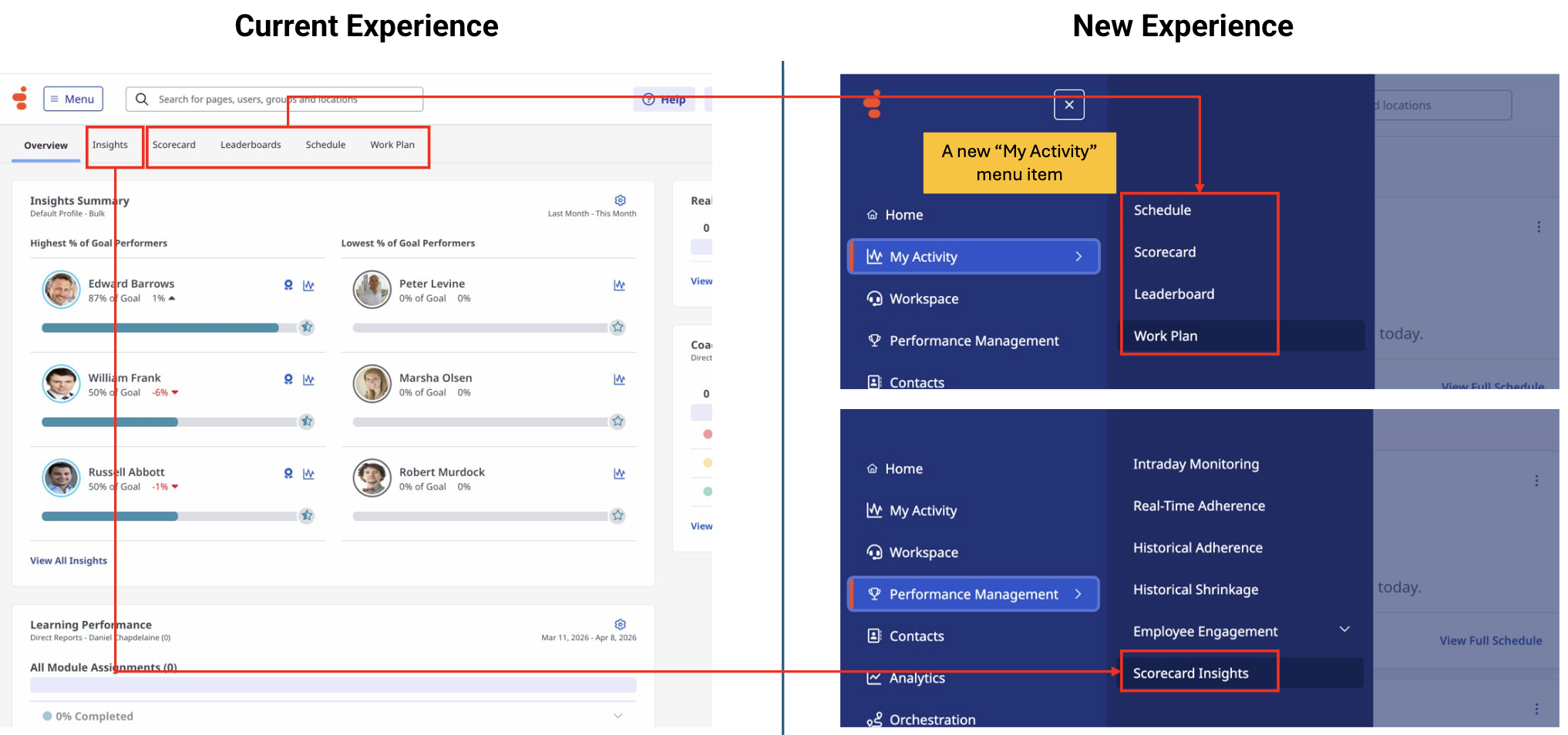 - Tabbed pages previously within Activity pages (e.g. Insights, Scorecard, Schedule, Leaderboard, Workplan) are now accessed via sub menus on the main navigation.