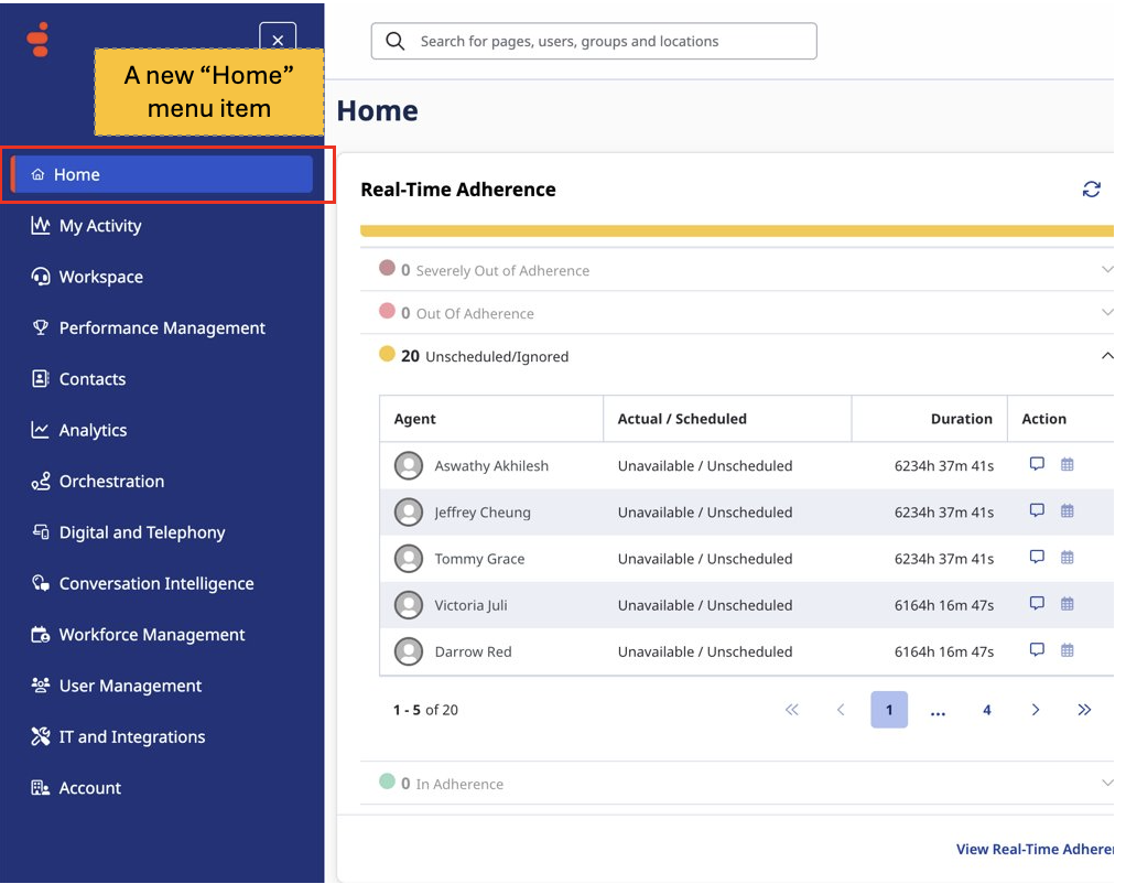 Genesys Cloud is moving the existing Activity Overview experience into the new User Home, bringing Activity insights directly into a single workspace for agents and supervisors. User Home is accessible from the main Genesys Cloud navigation menu via a new “Home” link.