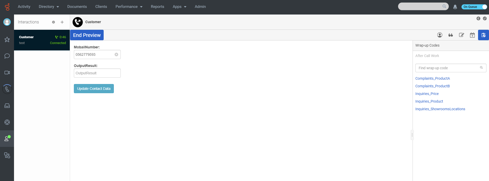 Please note, even after Wrapup-Code was selected, the following view was shown until agent clicked on "End Preview"!