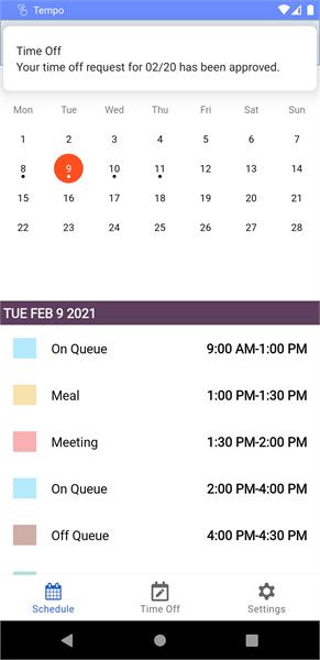 - Push notifications – Agents can receive push notifications when schedules change, are added or removed, as well as notifications of denied or approved time-off requests.