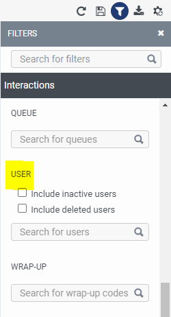 1) If you want an agent to ONLY see their interactions, this requires you to assign permissions below; these permissions allow an agent the ability to search by username, under filters, in the interactions[performance]