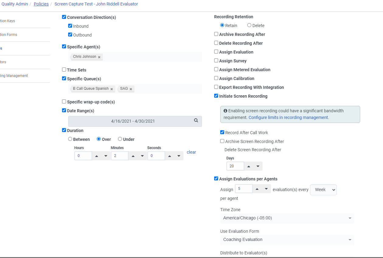 We are in the process of testing screen capture before launching it to the entire contact center. I created the policy listed below, but the evaluation that was assigned did not have screen capture attached. What did I do wrong? Can anyone provide guidance on how to just launch screen capture on one agent for testing purposes?
