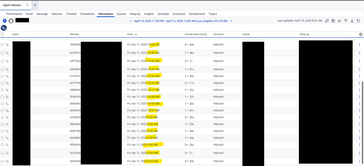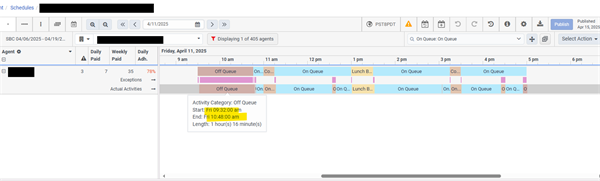 This is what's showing under the schedule adherence. The second screenshot attached is the agent's interactions, so the agent was on queue and accepting calls, however WFM logged it as "Off Queue"