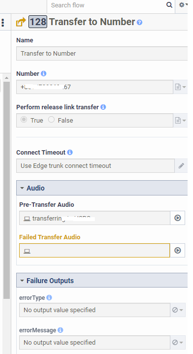 there is a flow has a simple task, inside the task, there is only 1 action 'Transfer to Number'.
