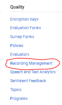 For Recording Management to show up as a link under Quality tab section of Admin, I have had to add Quality Administrator Role to Users.  They have Supervisor Role, Quality Evaluator Role and some Performance Management Admin.  I do not know what permissions truly allow Recording Management to show under Quality.  I would prefer to Custom Qual Eval or Supervisor if able. Outside clients login to GC to QA.  I do not want to allow any recording deletions as well.