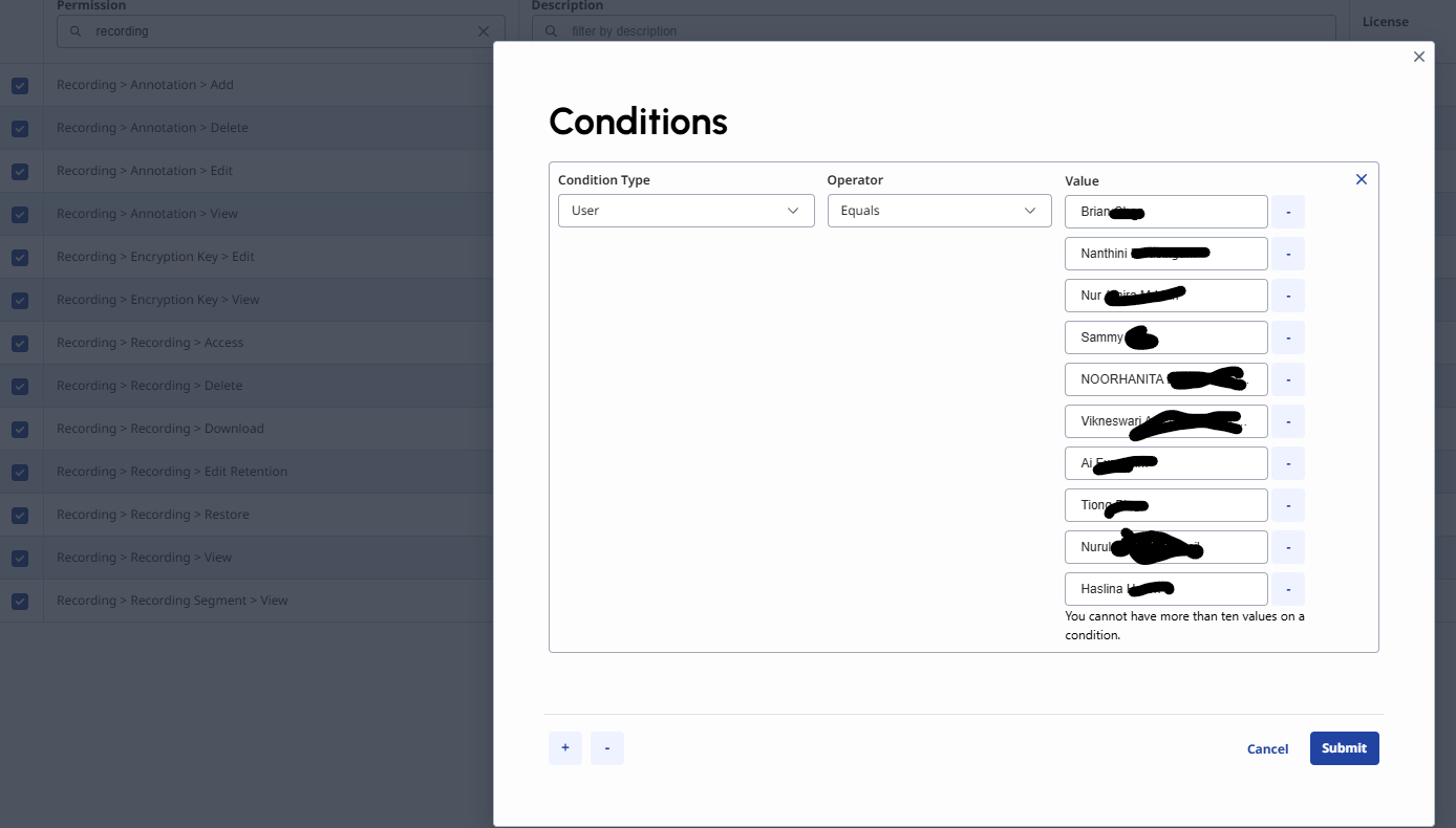 If you are looking for access control at the Recording Segment level, the user (supervisor) cannot have Recording > Recording > View permission, because it grants ALL recording content for the interaction it is privileged.  You must instead be only using Recording > RecordingSegment > View with the appropriate conditions.