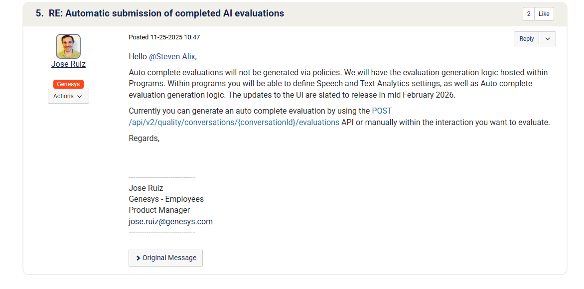 I'm not sure if it's related to your question, but Genesys released an API for the quality module in January and mentioned on the Ideas portal that they will release reports in the user interface by the end of the year.